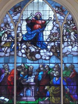 Stained glass: The Assumption representing the Assumption of the Virgin - after which our parish is named.